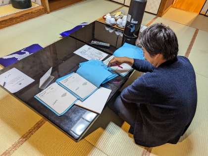 今日1日の振り返りを確認しています。1日目、有意義に過ごせたようです。感想を共有し、明日の活動に生かします。そろそろ消灯の時間です。今日はたくさん動いて疲れていると思います。
