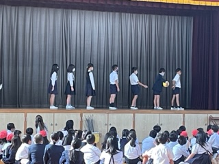 講堂で集会委員会によるゲームがありました。ボールを落とさないように手渡すゲームです。
