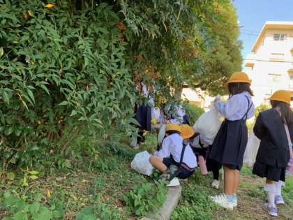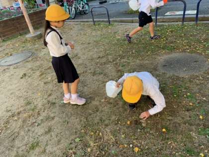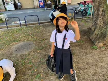 ? 公園の清掃後、あきみつけをしました。学校にない落ち葉に興奮していました。黄色い葉っぱや赤い葉っぱ、木の実など秋をたくさん見つけました、