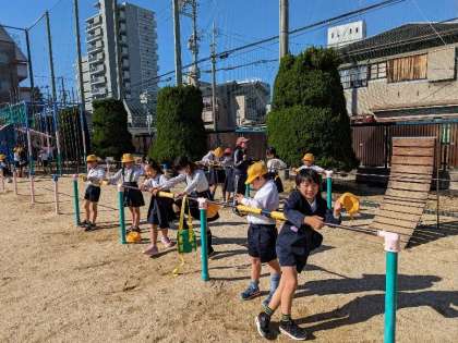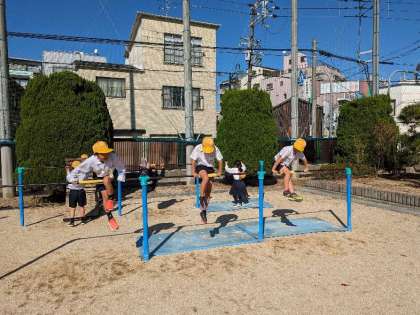 鉄棒名人への道。膝掛け回りへの挑戦。どんどん上手になっています!片付けも丁寧にベルトを畳んで、次に使う人のこともしっかり考えています。