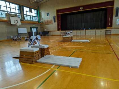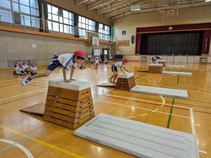 開脚跳び、かかえこみ跳びにチャレンジしています。安全に着地できるようにスピードや踏み切りの強さを調整しましょう。