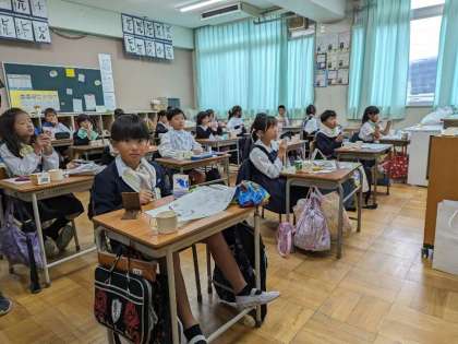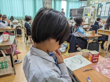 本校養護教諭による歯磨き指導がありました。色による磨き残しに気づき、歯ブラシの動かし方など、鏡をしっかり見て自分でチェックしています。
