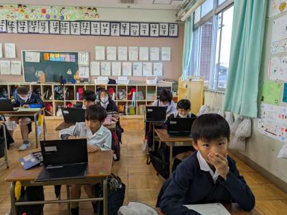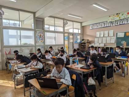 パソコンを見ながら自分たちでテスト対策の学習をしています。資料からしっかり読み取ることができています