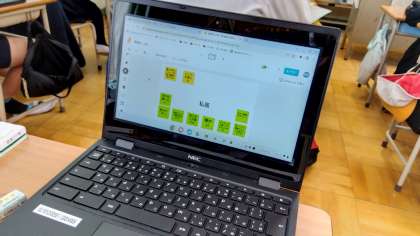 、パソコンの付箋機能を使って学習を進めています。「立場を明確にしながら話し合う」という単元めあてに沿って、自分の意見、友達の意見等付箋を色分けすることで立場を明確にし、話し合いを進めることができました。