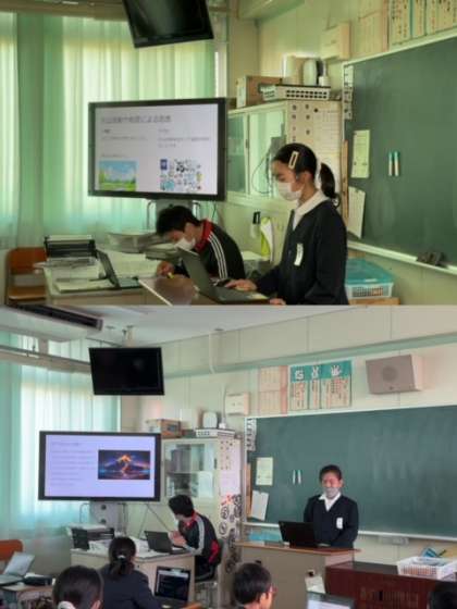 ?今まで学習したことを元に、地震や火山活動についてのスライドを作成しました。画像や資料を使い、一人ひとりが工夫して素晴らしいスライドができました。