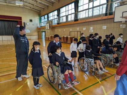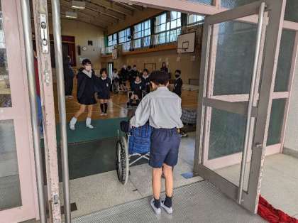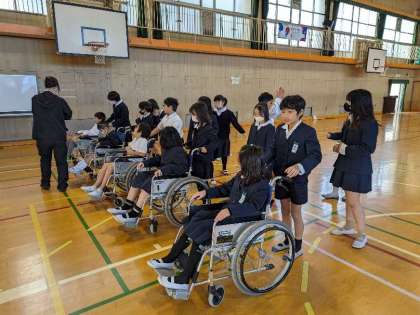 車椅子に乗っている人の気持ちを考えて安全に押します。下り坂は後ろ向きでブレーキをかけながら進みます。