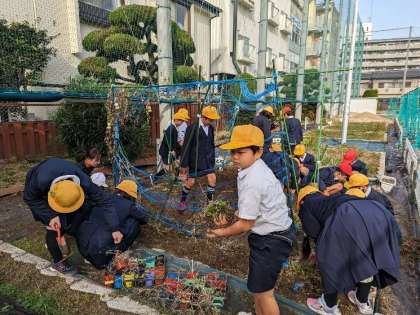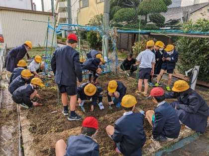理科の学習で学習園の雑草を抜いて新しい植え付けに準備しています。