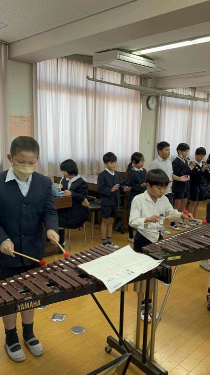 茶色のこびんで発表会です!校長先生と森先生、田原先生がお客さんです。各パートで協力しながら力強い立派な合奏でした。