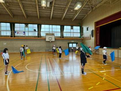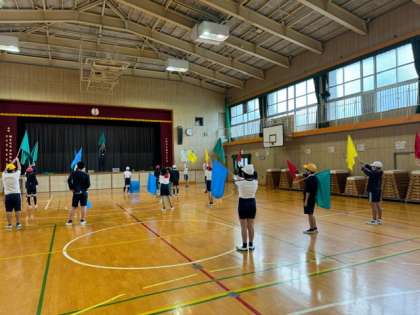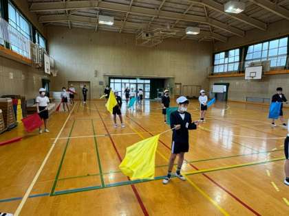 フラッグの振り方や持ち方を聞いています。少し音楽に合わせて振ってみました。
