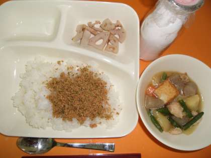 鶏肉とじゃがいもの煮もの 焼きれんこん 紅ざけそぼろ
