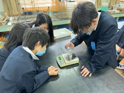 食塩を水に溶かす前の全体の重さと、水に食塩を溶かした後の全体の重さは変化するのかを調べる実験をしました。電子てんびんを使って慎重にgを計り重さを比べることができました。