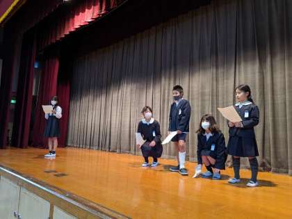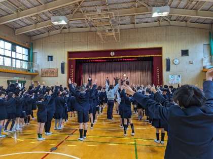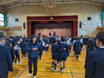 集会委員会が考えるゲームを、縦割り班で協力して楽しく過ごしています。