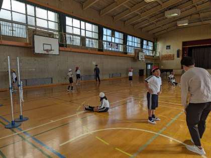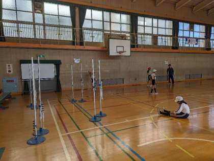 体育館の中で走り高跳びの足の振り分け方の練習をしています。リズムよく高くジャンプできるように頑張りましょう。