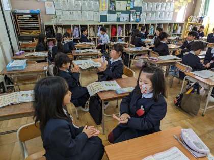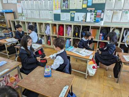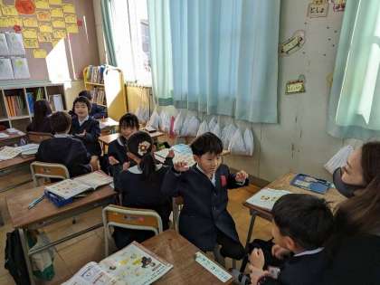 おちゃらかの音楽に合わせて、じゃんけんあそびをしています。勝ち、あいこ、負けに自分の動きを付け加えています。昔ながらの遊びで盛り上がりました。おちゃらかブームが1年1組に巻き起こっています。