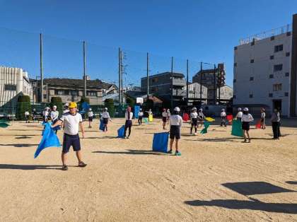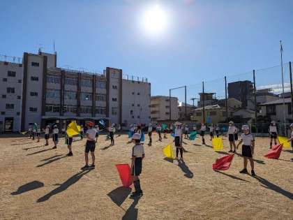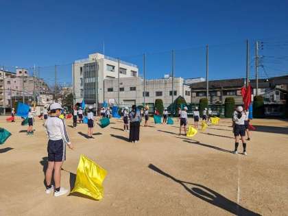今日から運動場でフラッグの練習です。青い空に4色のフラッグがとても映えています。練習を重ねていくと気持ちが乗り移ってきます。思い残す事のないよう全力で取り組んでほしいです。