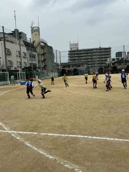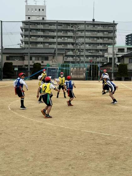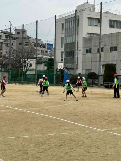 タグラグビーをしています。前に前に向かって作戦を立てながら進んでいきますが、思うように進めません・・・。さあチームで協力して頑張っていきましょう!!