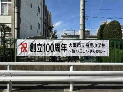 正門横と北側のネットに横断幕を設置しました。100周年を盛り上げていきたいと思います。