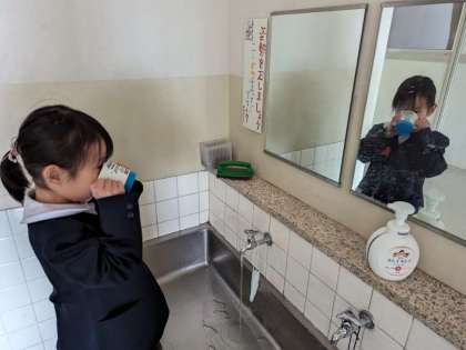 ご飯を食べたら、うがい、歯磨きをします。食育とともに口腔ケアも大切です。美味しくいただけるように口の中も清潔に保ちましょう。