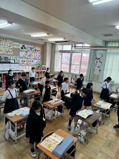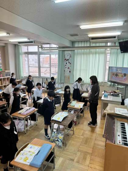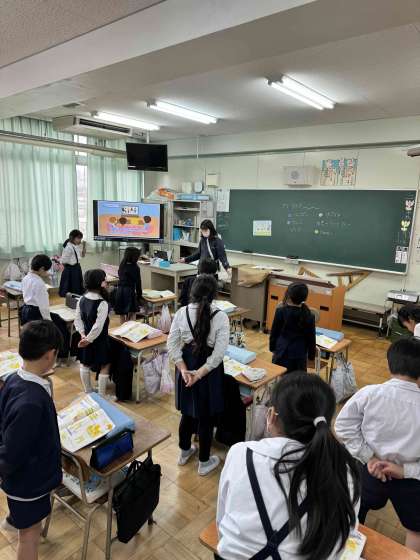 みんなで楽しく英語活動をしています。耳を慣らす。単語に親しむ事で上達していきます。
