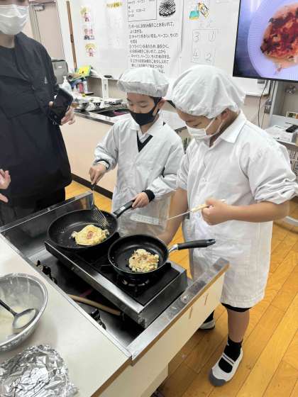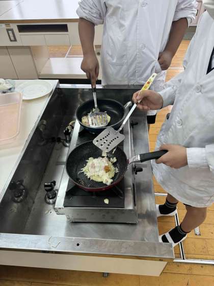 今日は調理実習でお好み焼きを作りました。具材はキャベツ、ベーコン、ちくわです。班で協力しながら調理することができました。