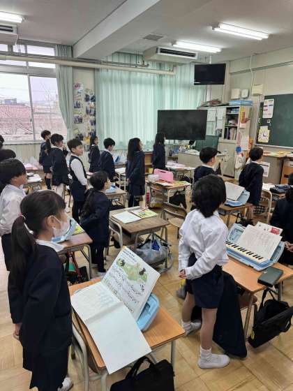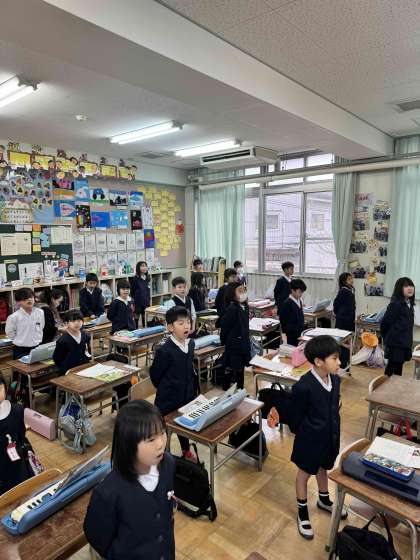入学式で新一年生に教えてあげる校歌を素敵な歌声で歌っています。