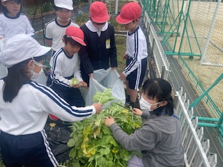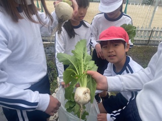 体育の前に学習園で育てた大根とかぶの収穫をしました。葉をぬくと、土の下からおいしそうな大根とかぶが出てきました。みんなとてもいい顔をしていました。