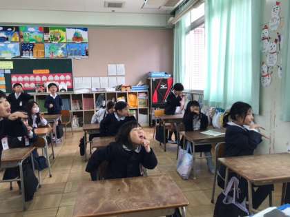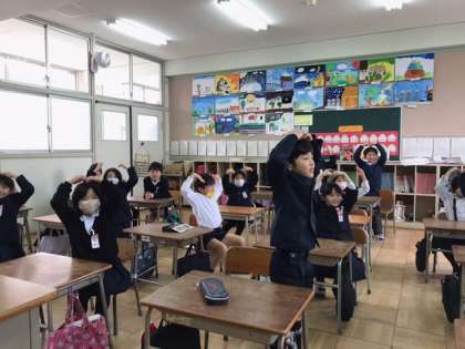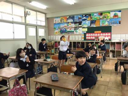 金曜日のチャレンジタイムは英語です。今日は英語の歌をたくさん歌いました。歌いながらテレビと同じ動作をしています。