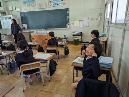 がんばったことの発表をしています。鉄棒をがんぼったという話に耳を傾けていました。