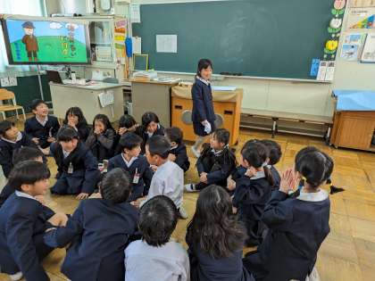 学級遊びでハンカチ落としをしていました。ルールを守って仲良く遊ぶことができました。2年生でも、ルールを守ってみんなと仲良くすごしてほしいです。