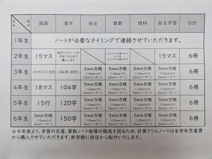 ・今年度より計算ドリルノートは全学年児童費から購入させていただきます。