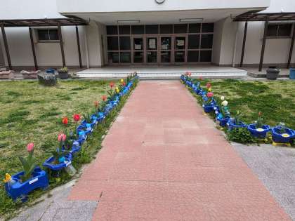 中庭のチューリップが講堂入口へと繋がりました。暖かくなって、日々の水やりの成果、急成長です。