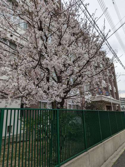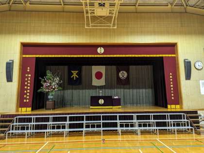 壇上に花も飾られ、新1年生の入学に向けて準備が整いました。校庭の桜も、少しずつ開花しています。