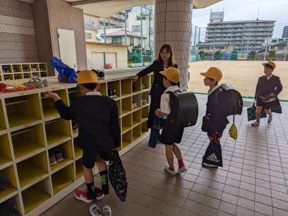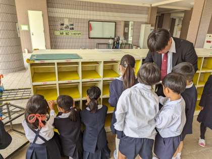 新学年、新クラス、新ロッカー、新傘立て、他にもたくさん新しくなったものがあります。自分の使うところにシールを貼っています。