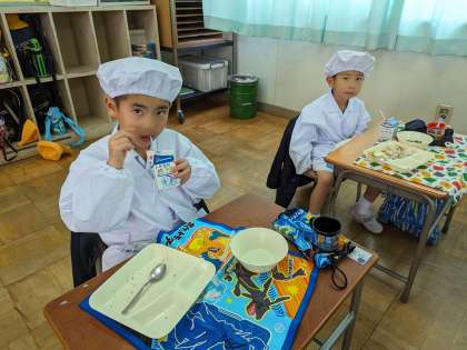 6年生に運搬してもらって、先生が器によそったものを自分の机に持っていくことにも慣れてきました。食器を渡したときに、「ありがとう」と言えるその素直さに、こちらもしっかりと指導していきたいと胸を熱くしています。たくさん食べて、大きくなってね!