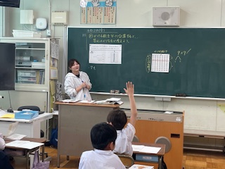 「かける数を分けて計算すると、答えはどうなるか考えてみよう」という学習をしました。たくさんの児童が手をあげて発表していました。