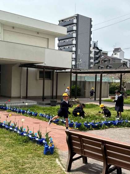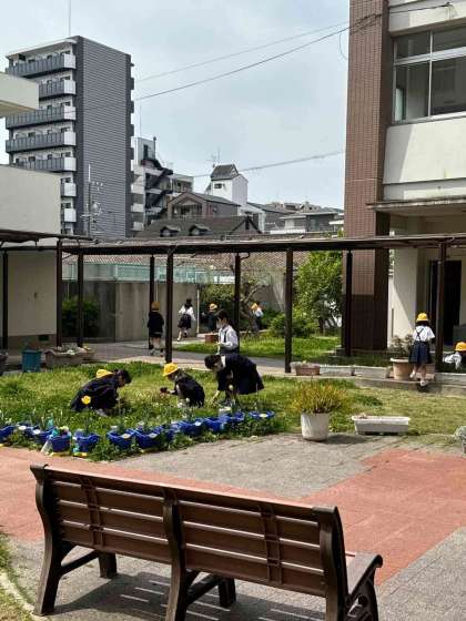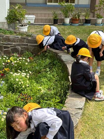 生き物さがしや四つ葉のクローバーを探しています。今日は汗ばむほどの気温ですが元気に遊んでいます。