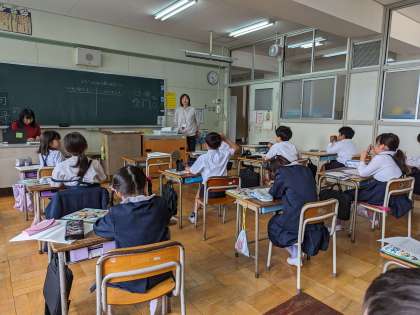 私たちの身の回りにあるお店をワークシートに書き出しています。商店街には、お店がたくさんありますね。