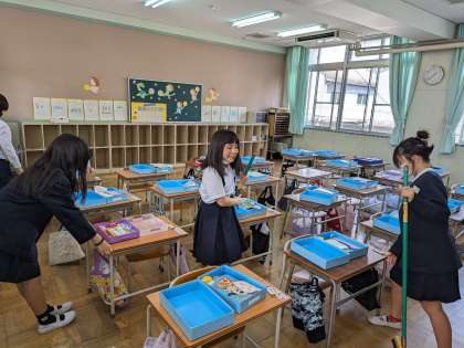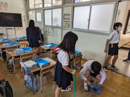 1年生の教室を6年生が掃除しています。これから掃除の仕方も説明して1年生が自分たちで掃除できるようにサポートしていきます。