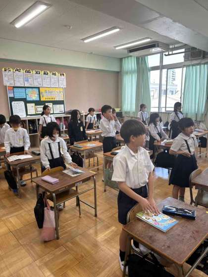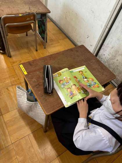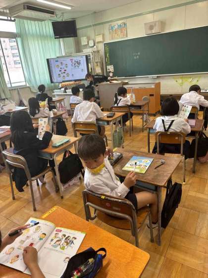 英語の教科書が配られました。子どもたちは初めての経験でとてもうれしそうです。