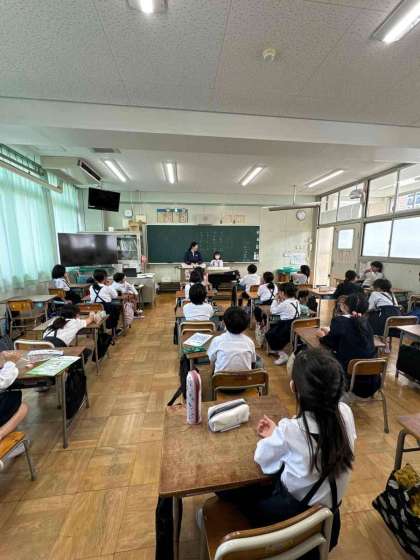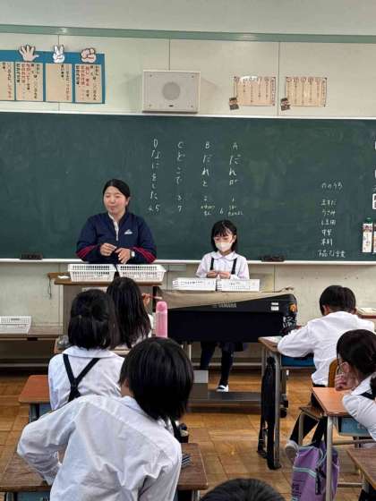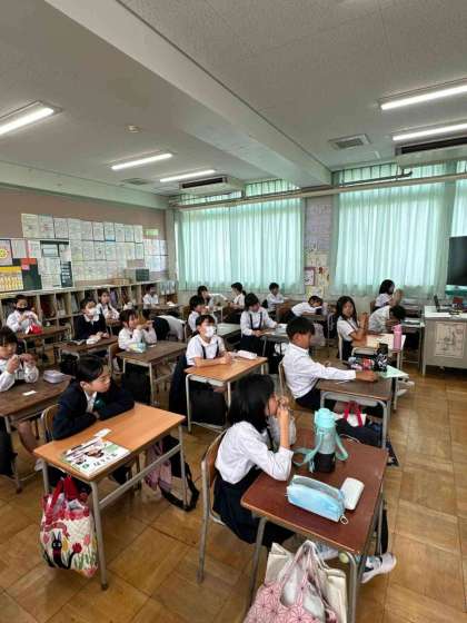 「だれと」「だれが」「どこで」「何をする」という4つのワードをそれぞれがバラバラに記入し、ランダムに組み合わせて文を作って発表していました。「校長先生とお父さんがユニバで宿題をする」などの文が完成し、4−1は大爆笑に包まれていました。