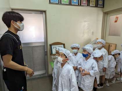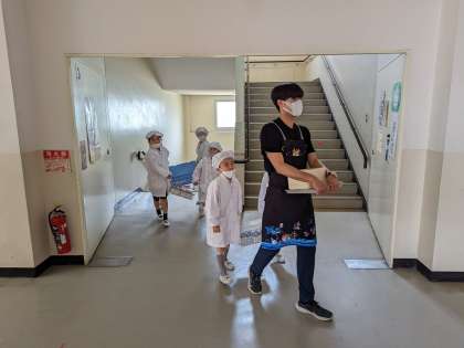 給食室に入っていただきますの挨拶と共に食器類を持ち運びます。挨拶もしっかりと覚えましょう。