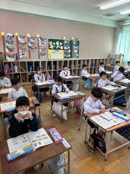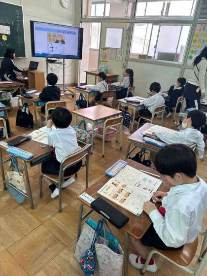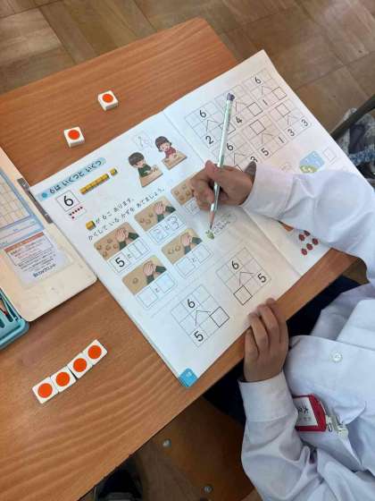 「いくつといくつ」の学習を行っています。ブロックを操作しながら課題を解決し、先日習った数字を丁寧に書いています。