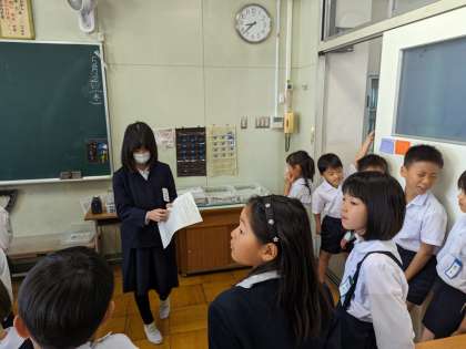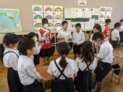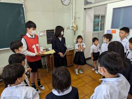 今年度初のたてわり班活動です。6年生が1年生を迎えに行き、グループ全員の自己紹介をしています。今年1年間よろしくね。みんなでルールを守って楽しく過ごしましょうね。