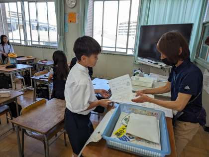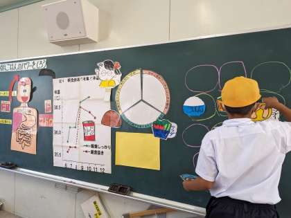 栄養職員による栄養のことを考えた食育の指導です。成長期の体づくりを支えるのが食です。好き嫌いせず、バランスよく食べることが、今の時期とても大切です。