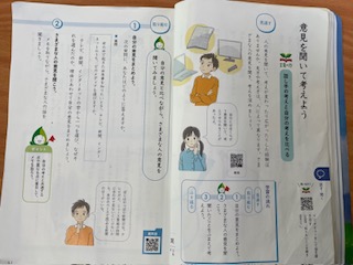 「意見を聞いて考えよう」の学習で、クラス全体で意見を交わしていました。話し合い活動に生かせそうです。