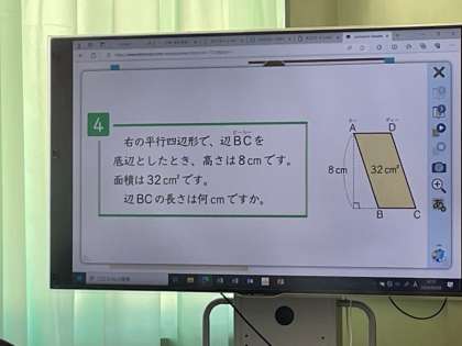 平行四辺形の面積から高さを求める問題をしました。求める高さをXとして解きました。