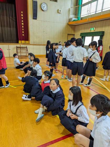 今年度初のたてわり集会です。講堂で並び替えゲームをしています。