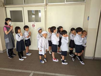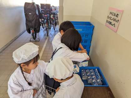 飲み終わった牛乳パックを丁寧に揃えています。美味しい給食、ごちそうさまでした。
