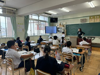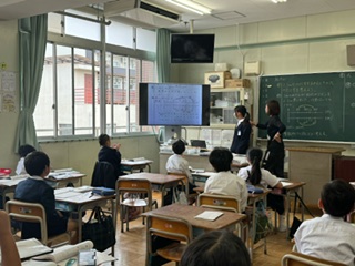 班で自分の考えを発表しあい、代表者が前に出て、みんなの前で発表しています。