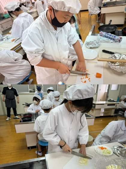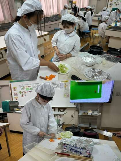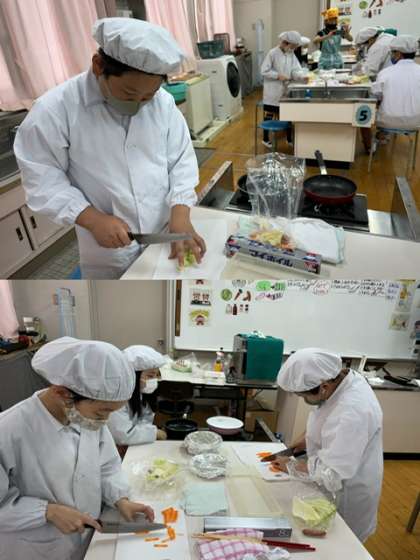 包丁の持ち方に気をつけ、キャベツ、にんじん、ウインナーを食べやすい大きさに切ることができていました。